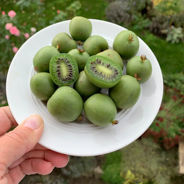 Ab September reifen die etwa 2–4 cm großen, glattschaligen Früchte. Sie ähneln kleinen Trauben-Kiwis, sind grün oder rötlich gefärbt, weich, saftig und süß – mit typischem Kiwi-Aroma. Sie können mit Schale verzehrt werden und sind reich an Vitamin C, Antioxidantien und Mineralstoffen. Ideal zum Naschen, für Obstsalate oder Marmelade.